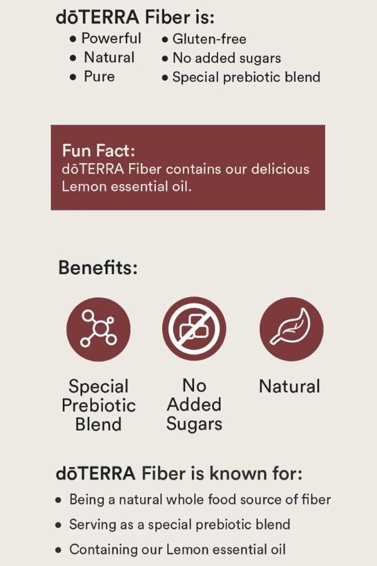 doTERRA Fiber is sourced from whole food sources like apple, tapioca, and flax seed to support a healthy and regular digestive system, control appetite, and support the metabolic process. Fiber is a fantastic macronutrient that supports many different health functions within the body, not just the digestive system, including the cardiovascular and the immune systems.