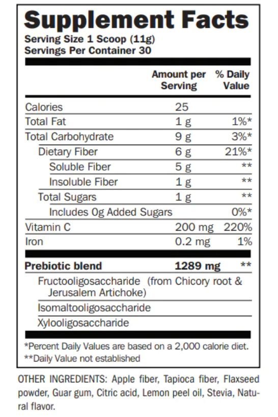 Apple fiber, Tapioca fiber, Flaxseed powder, Guar gum, Citric acid, Lemon peel oil, Stevia, Natural flavor. Prebiotic blend: Fructooligosaccharide (from Chicory root & Jerusalem Artichoke), Isomaltooligosaccharide, Xylooligosaccharide.